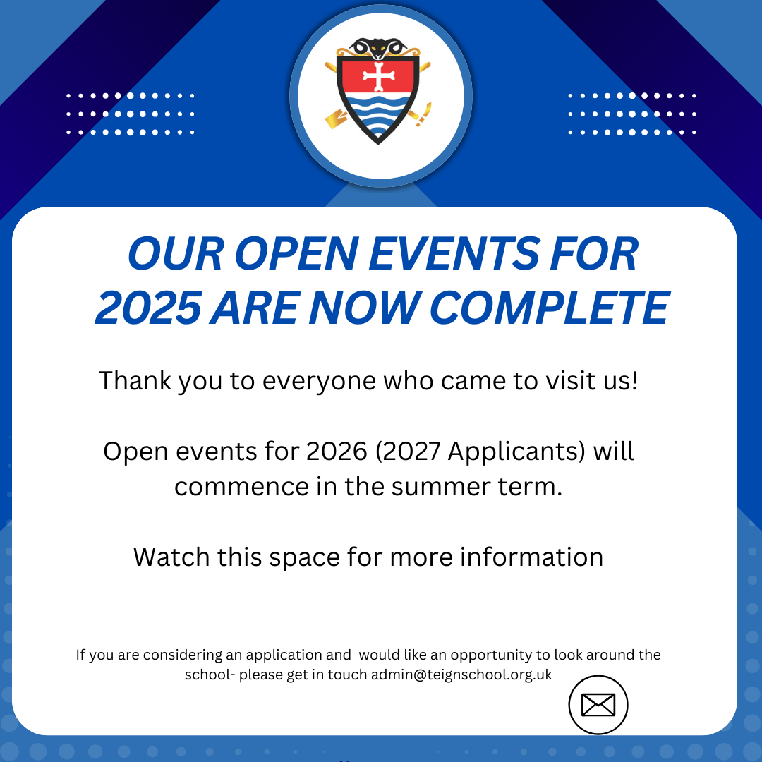 ParentsAttendance Term Dates Calendar Absence Request Form Admissions Extra-Curricular Clubs Free School Meals Key Stage 4 Options Open Events Parent Pay Friends of Teign School Prospectus PSHE and RSE Ready Respectful Safe Supporting with Assessment Ten Tors Times of the School Day Uniform and Equipment Virtual Tour Year 6 Transition Information Knowledge Organisers Home Open Events Open Events